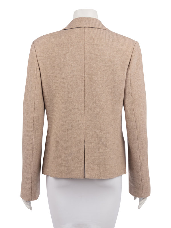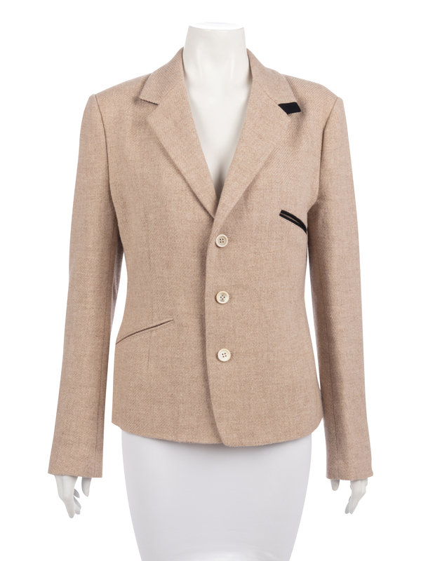 Oatmeal wool woven herringbone jacket trimmed with black wool crepe.