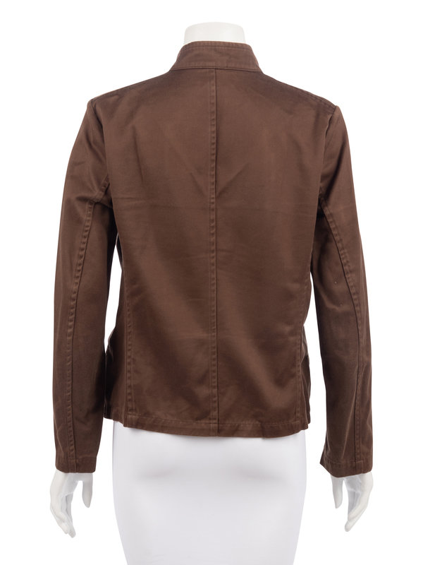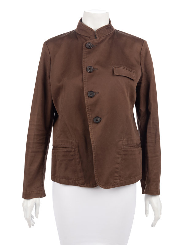 Brown cotton/rayon blend twill weave jacket with mandarin collar, hip welt pockets, and front button up closure.