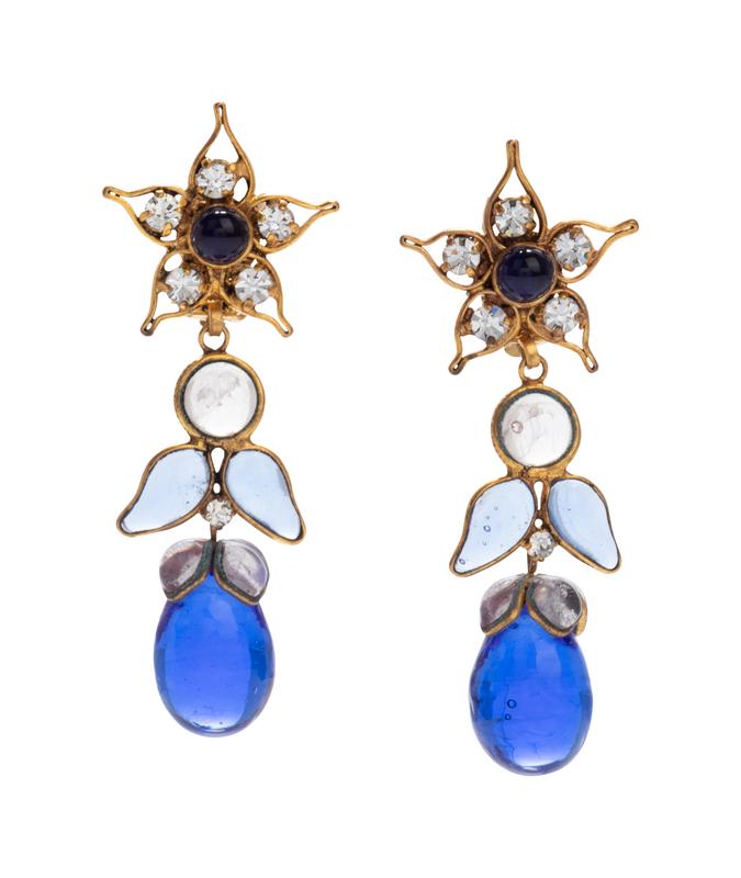 Gold-tone metal set with rhinestones and variegated blue-hue glass bead ear clips.