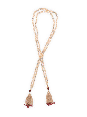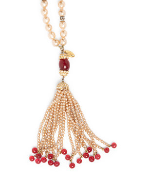 Cream rose colored pearl double strand tassel necklace with rhinestone set gold-tone metal and red beads.