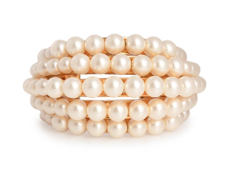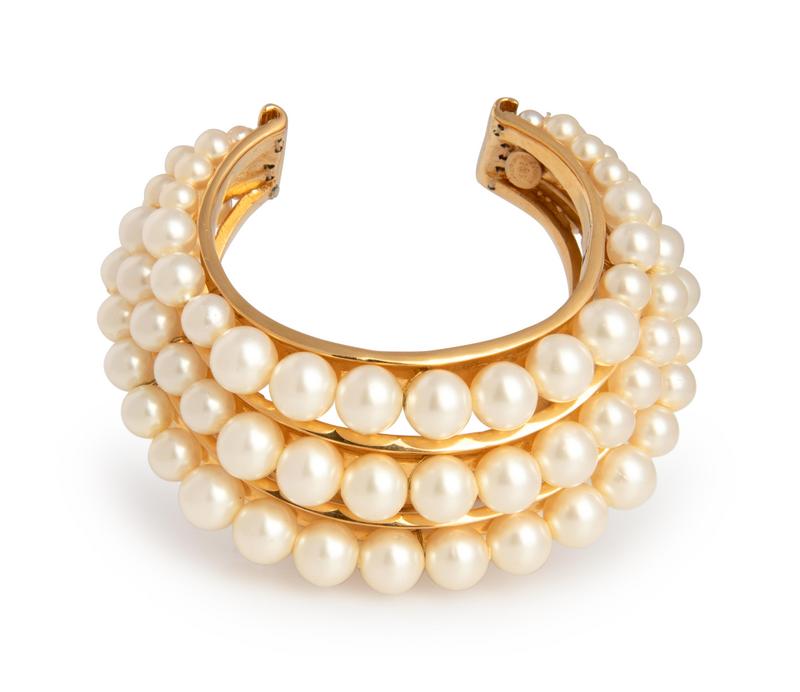 Gold-tone meal cuff with faux pearl bead strands. From Collection 23 in 1984.