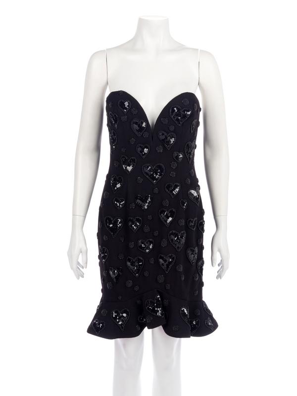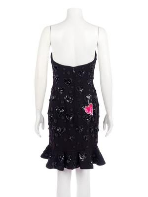 Black crepe strapless cocktail dress with black beading and sequin circles and hearts all over, one pink and silver heart on back, and skirt flounce lined in bright pink taffeta.