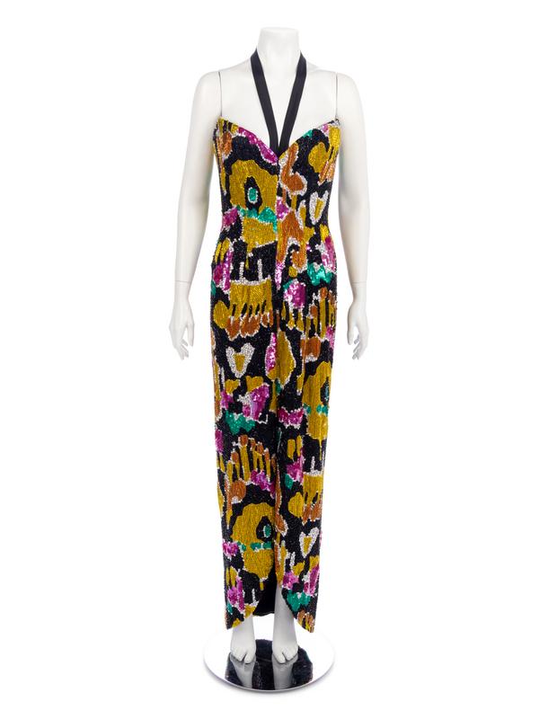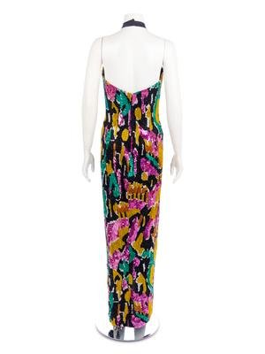 Black halter evening dress heavily embellished with black, orange, yellow, and silver bugles beads, green, pink, and silver, sequins, with front slit and center back zipper closure.
