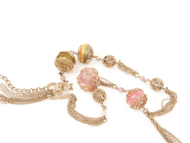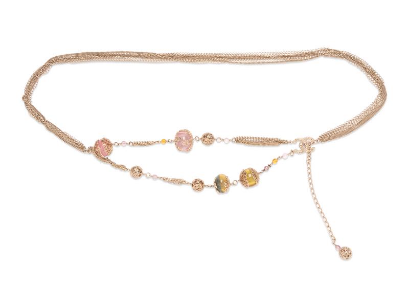 Gold-tone chain belt with multi-hued glass orb beads and CC logo hook closure.