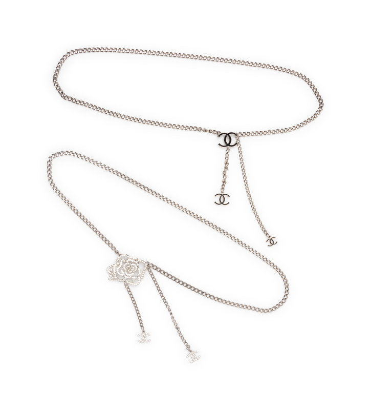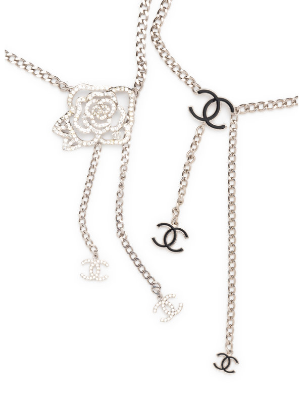 Silver-tone metal flat chain belt with rhinestone rose and CC logos.