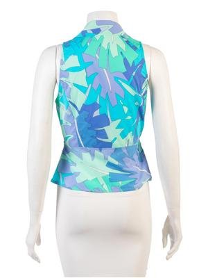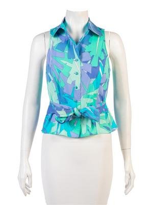 Blue, Green, and Purple printed cotton blend sleeveless blouse with collar, center front button closure, and waist tie.