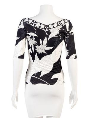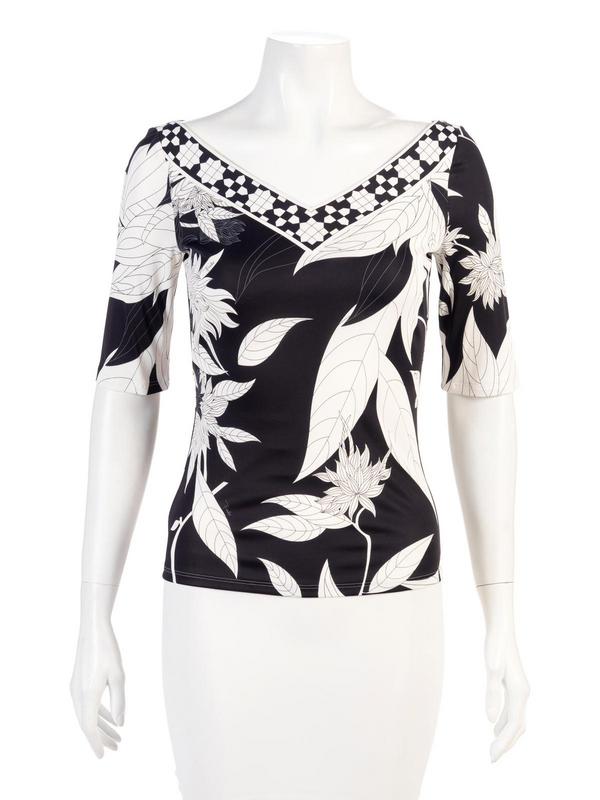 Black and white geometric and floral print top with wide V-neck and half sleeves.