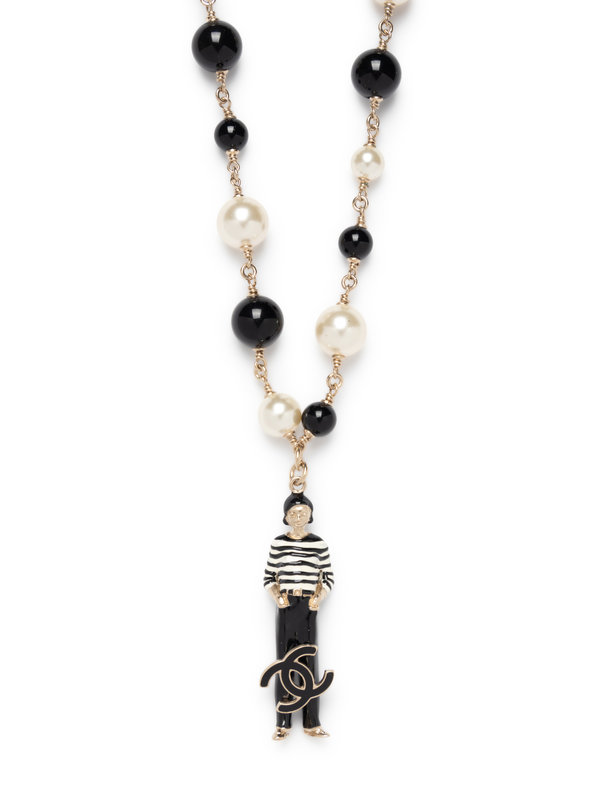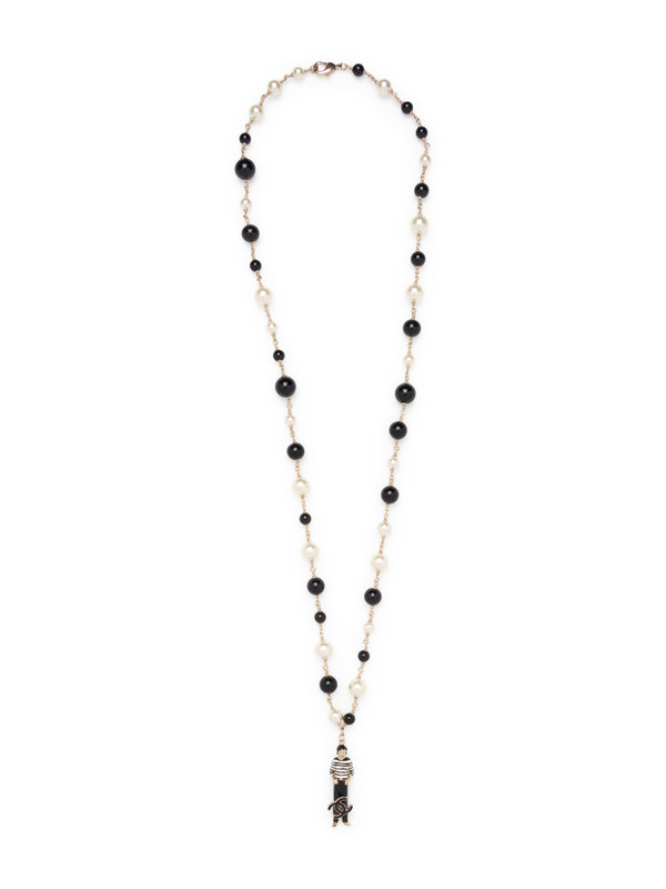 Faux pearl and black bead necklace with figure pendant and CC logo.