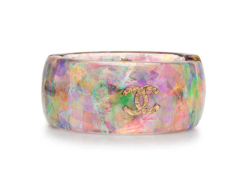 Clear acrylic hinged magnetic cuff with embedded holographic leaf and CC logo.
