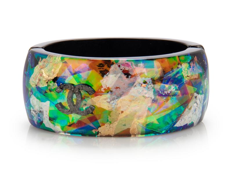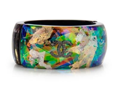 Black and clear acrylic hinged bangle with metallic leaf and CC logo.