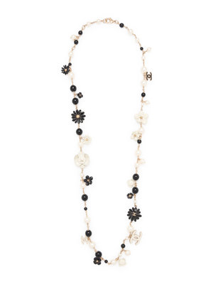 Gold-tone chain necklace with faux pearls, black orb beads, metal and enamel flowers, and CC logo charms.