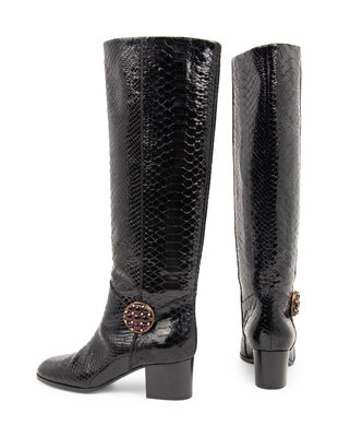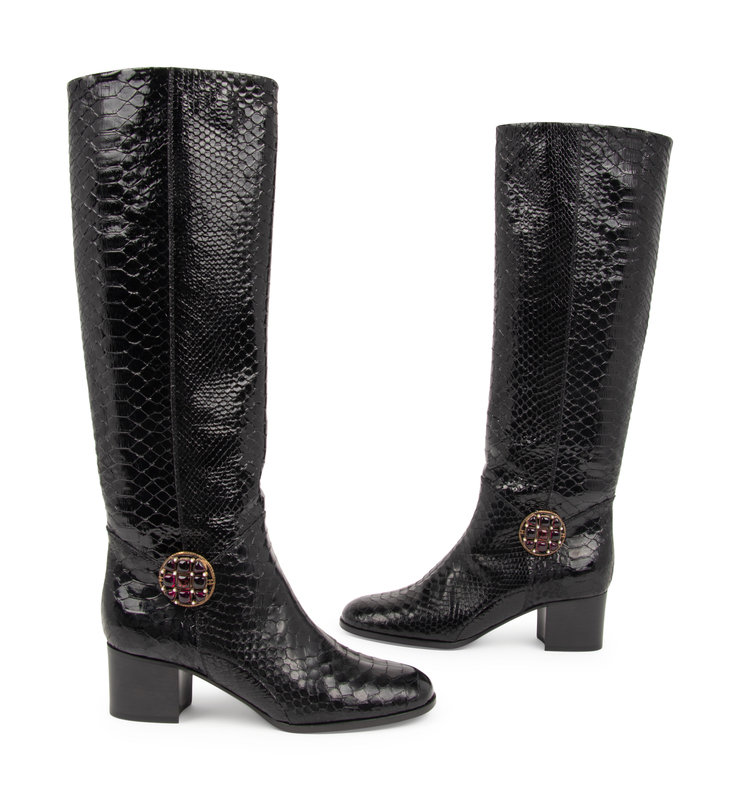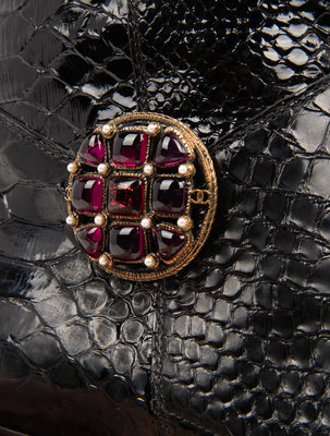 Black leather high boots with bronze-tone metal medallion set with faux pearls and purple glass stones.