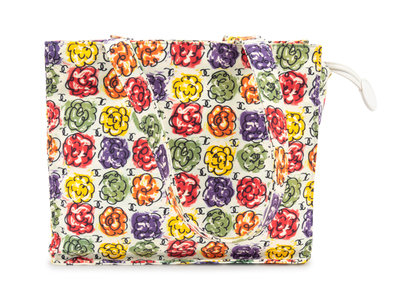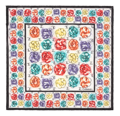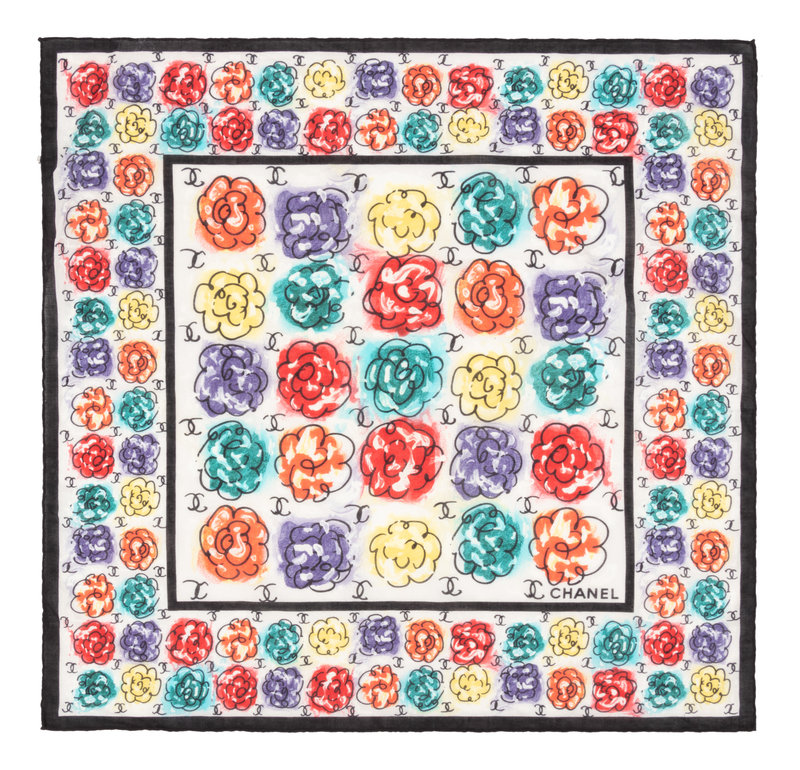 White cotton lawn with multi-hued printed rose rose and CC logo scarf.