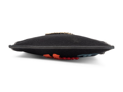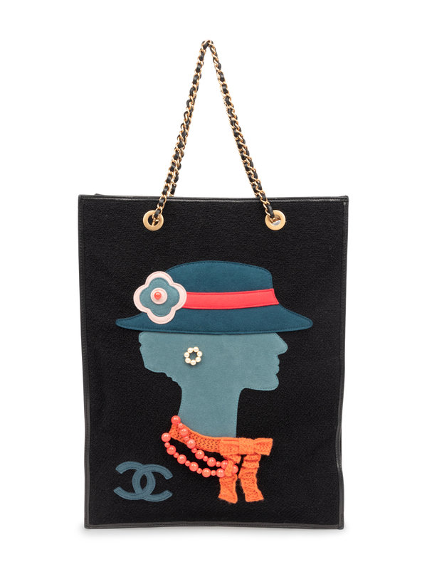 Black boucle tote bag with felted "Coco Chanel" design applique with faux pearls, red beads, and knit scarf, CC logo and gold-tone chain straps with black leather woven through, and black leather gussets.
