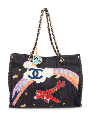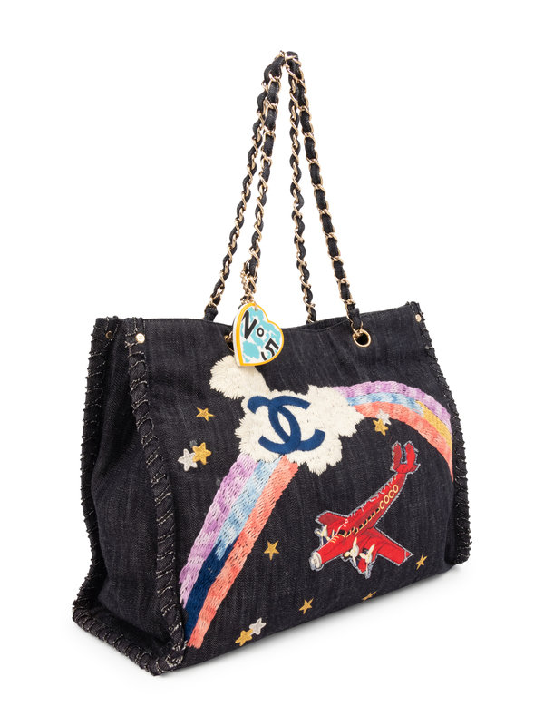 Dark denim shoulder bag with airplane and rainbow embroidery, gold-tone chain with denim fabric straps, and CC logo in cloud. There is also a heart-shaped plastic mirror with "No 5" on reverse.