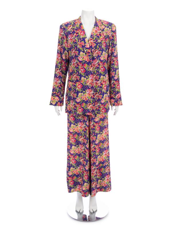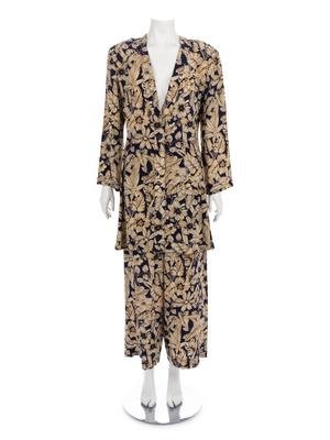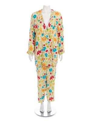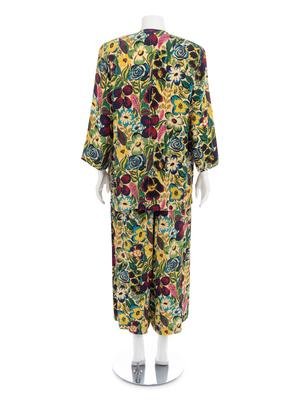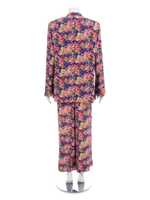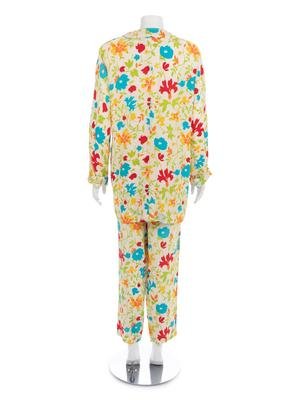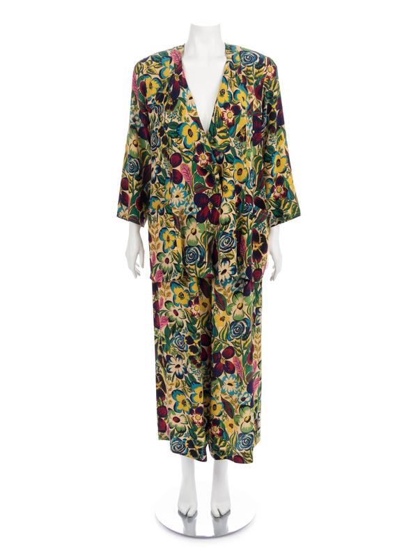 Ivory silk jacket ensemble with multi-hued printed floral pattern; paired with matching pleated, wide leg pants.