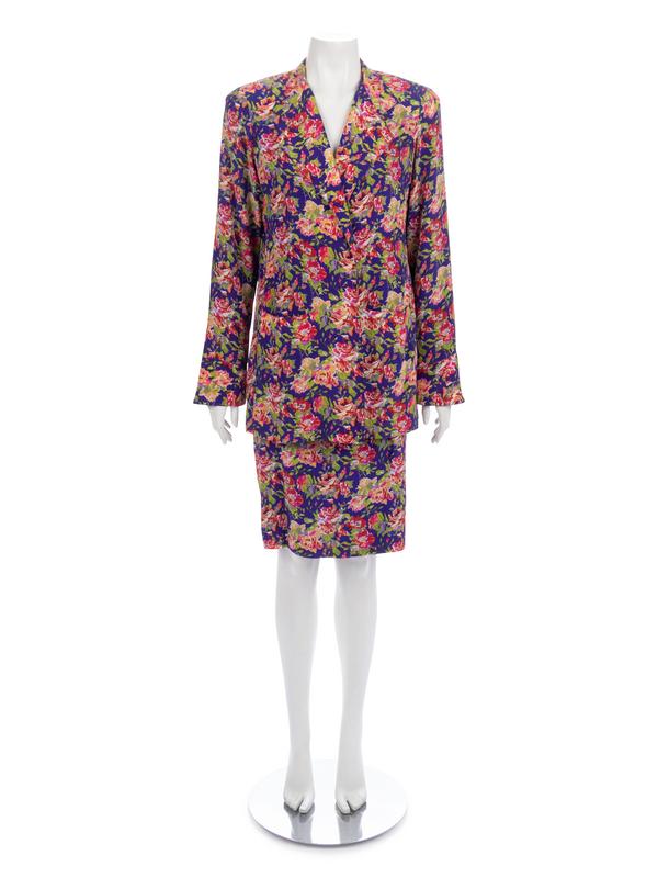 Purple silk jacket ensemble with rose printed jacket, paired with a matching straight fit skirt, and wide leg pants.