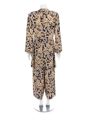 Navy silk jacket ensemble with with ivory floral print; paired with matching wide leg pants.