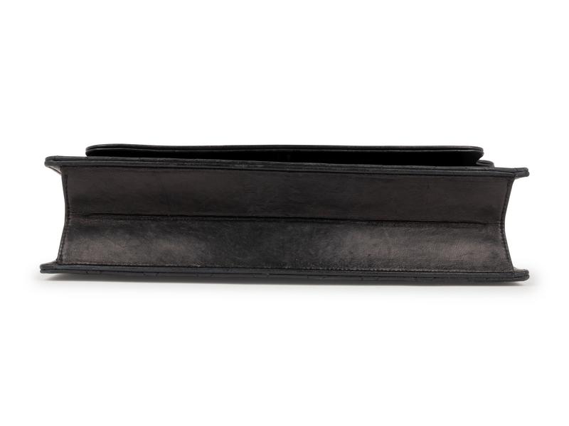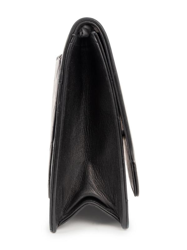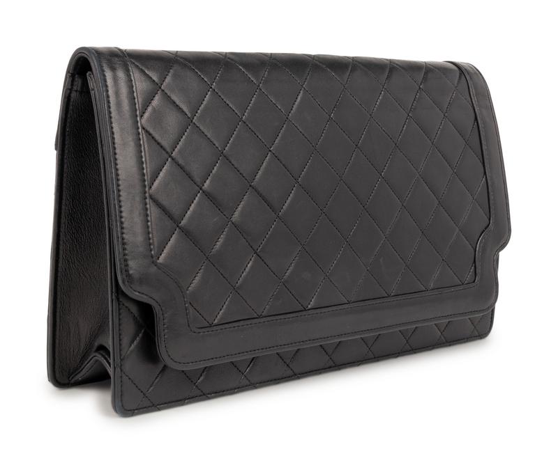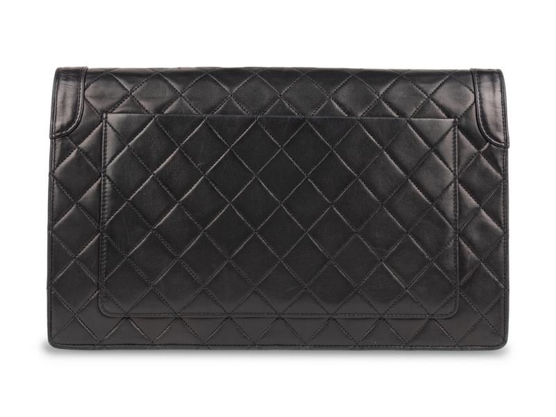 Black quilted leather clutch handbag with embossed CC logo on flap lining, gold-tone hardware, and lined in dark red leather.