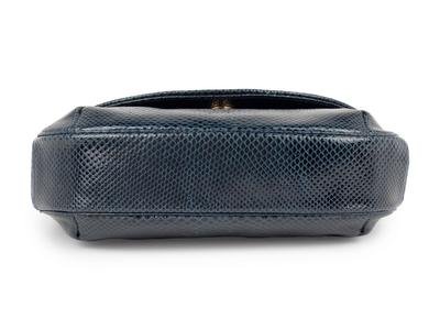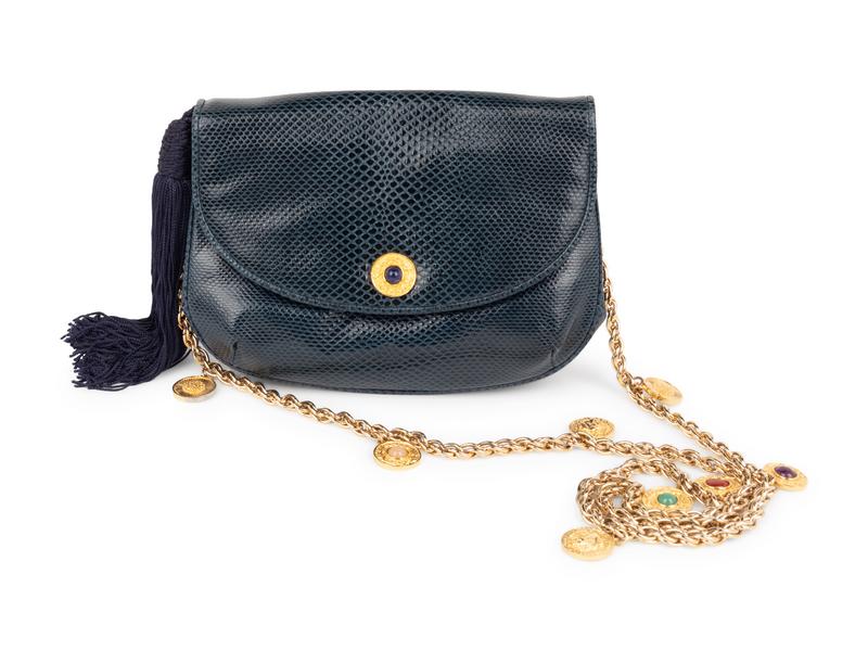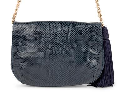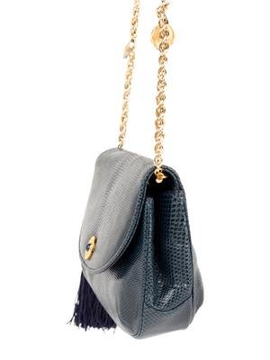 Blue rounded envelope in snake skin with chain shoulder strap with medallions and tassel. Included are mirror and comb.