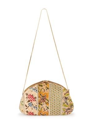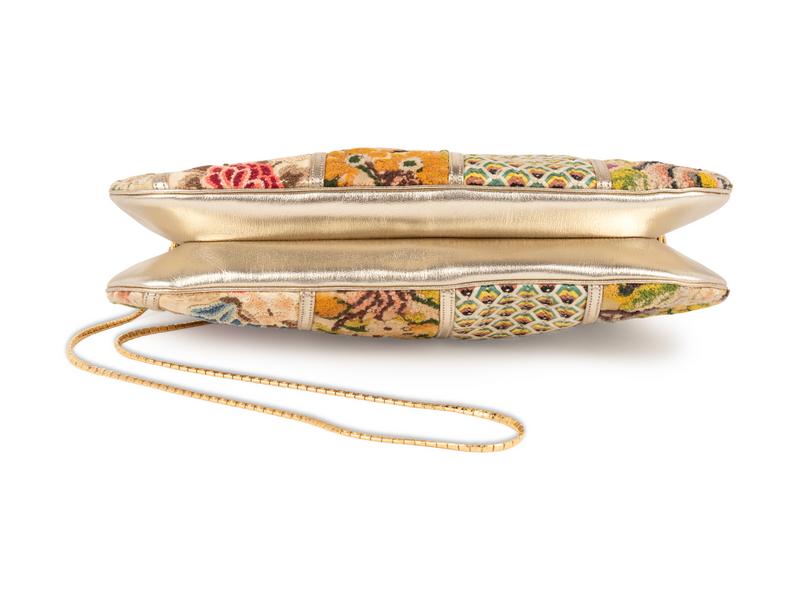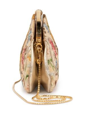 Gold kid leather on gold-tone metal frame bag with hand embroidery and gold-tone chain strap with mirror and gold kid coin purse.