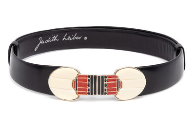 Black leather adjustable belt with silver-tone metal buckle inlaid with off-white acrylic and red and black enamel.