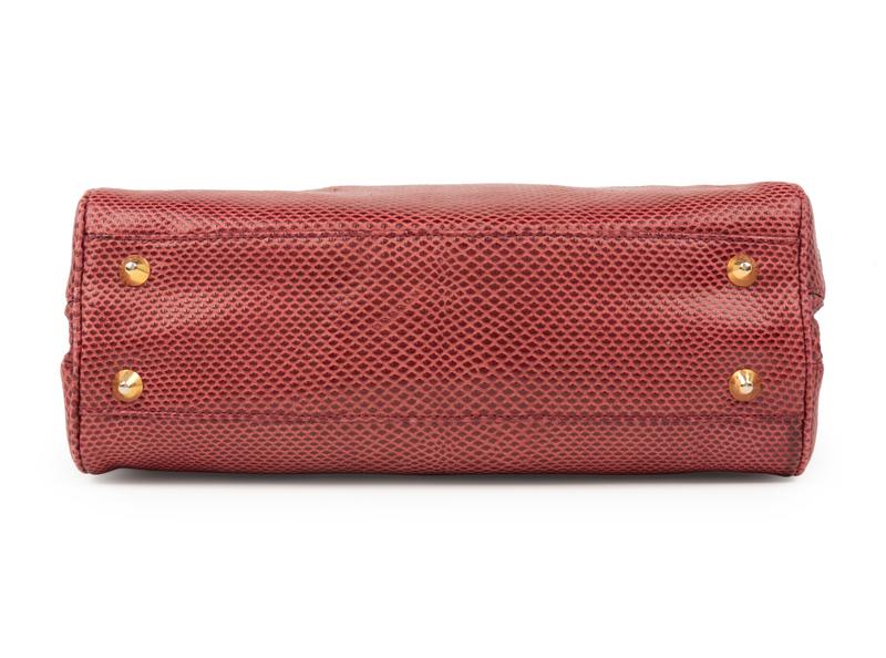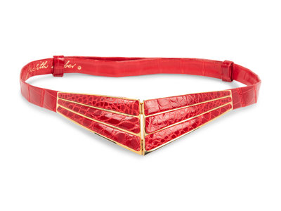 Red alligator leather adjustable belt with gold-tone metal buckle.