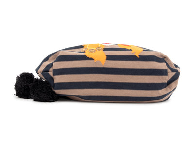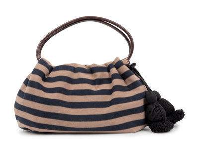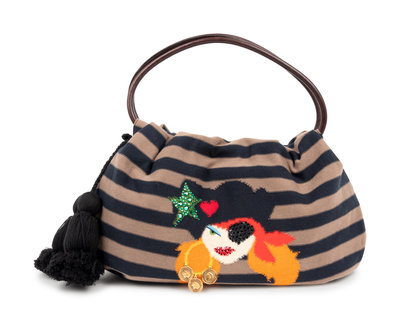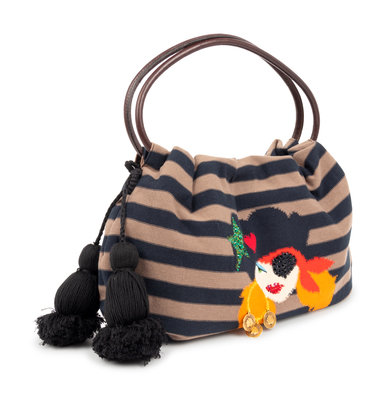 Black and taupe striped knit hobo bag with black yarn tassels, female pirate applique on front flap, and dark brown leather handles.