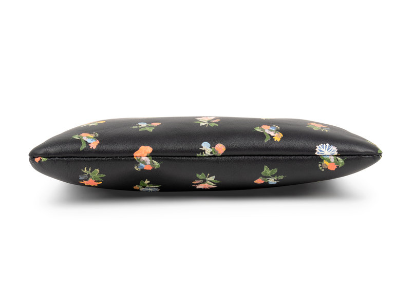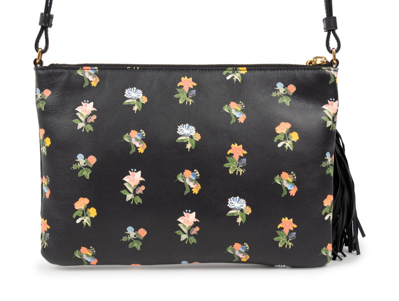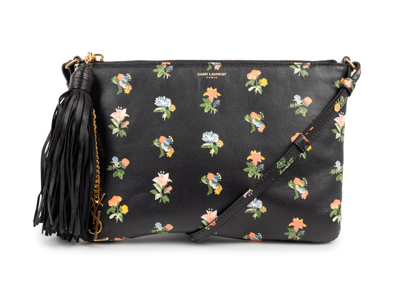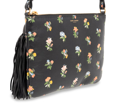 Black leather with multi-hued floral-print handbag, tassel with YSL chain, and gold-tone hardware.