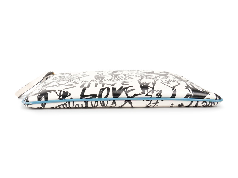 White leather with black sketched illustration print handbag with wrist-let zipper pull, blue piping, and lined in blue faille.