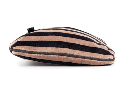Black and taupe striped velveteen handbag with rhinestone label and brass hardware.