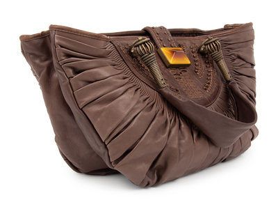 Brown calf leather hobo bag with gathered front and back, metallic copper finished woven leather detail, burnished bronze-tone hardware, and yellow/brown beveled enamel stone on closure.