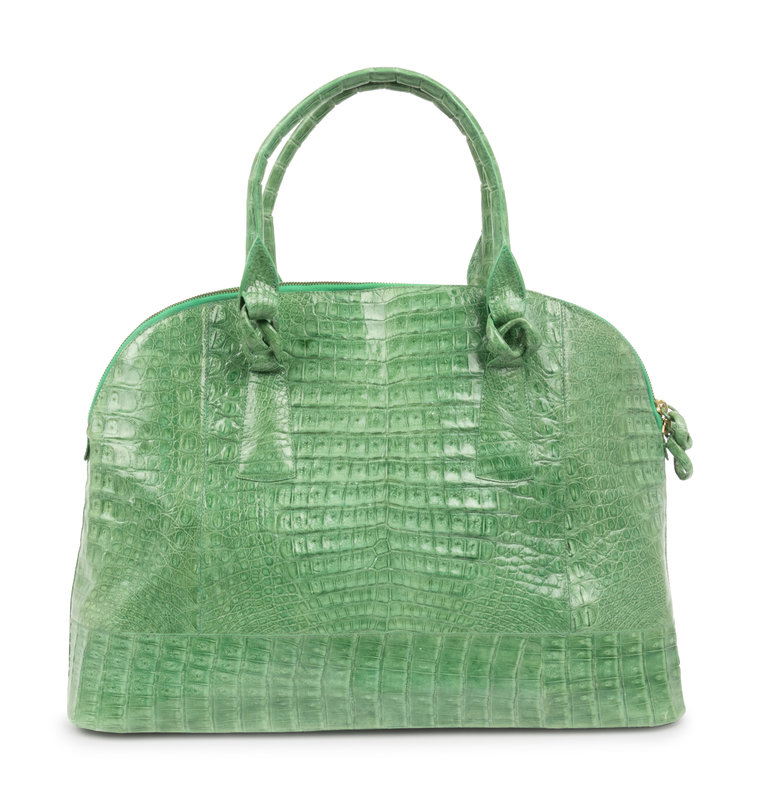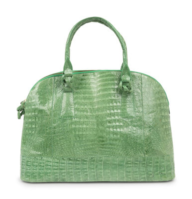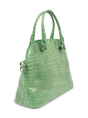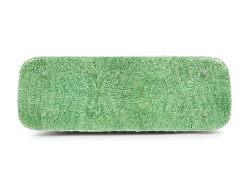 Green Caiman Crocodile zip top bag lined in white suede with inner zip pouch.