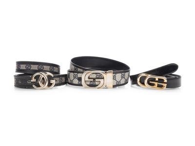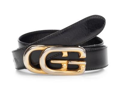 Gold-tone metal elongated GG logo prong buckle with black leather belt.