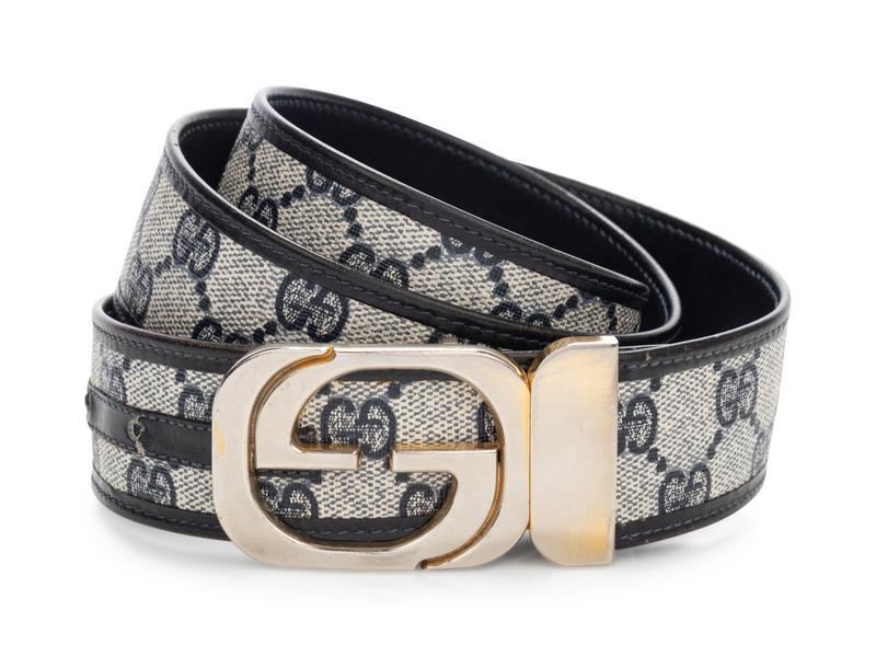 Gold-tone metal flattened GG logo prong buckle with dark blue GG logo printed leather belt.