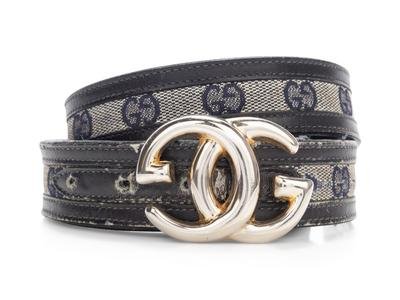 Gold-tone metal circular GG logo prong buckle with dark blue GG logo printed leather belt.