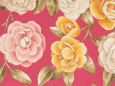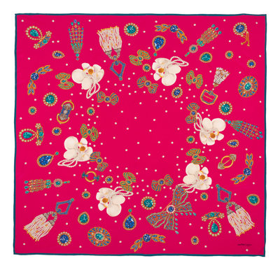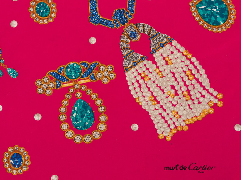 A solid magenta with various blue and and green jewels pattern, designed by Cartier.