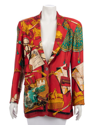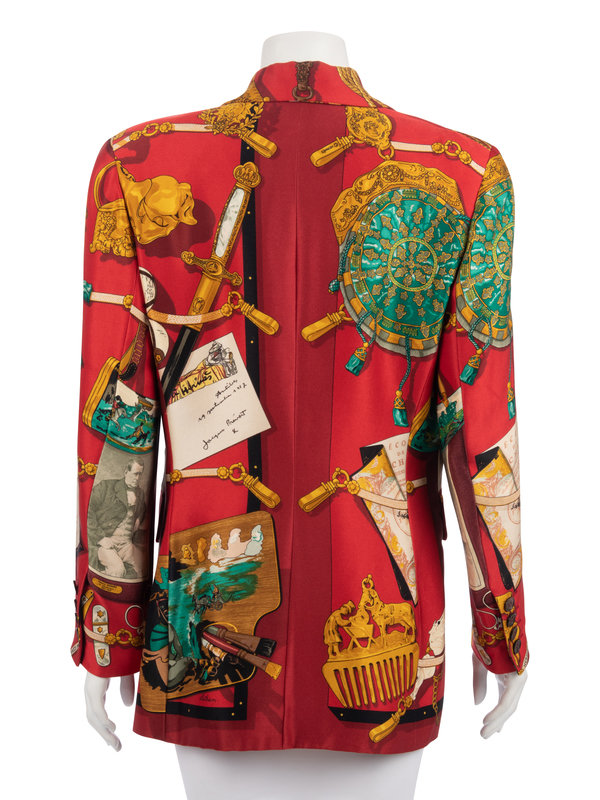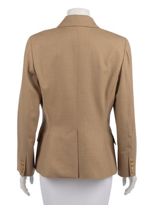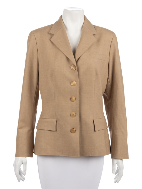 Beige wool suit jacket with single notch lapel, front hip flap pockets, and five button center front closure.