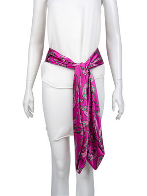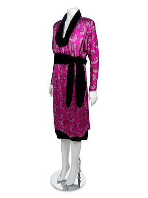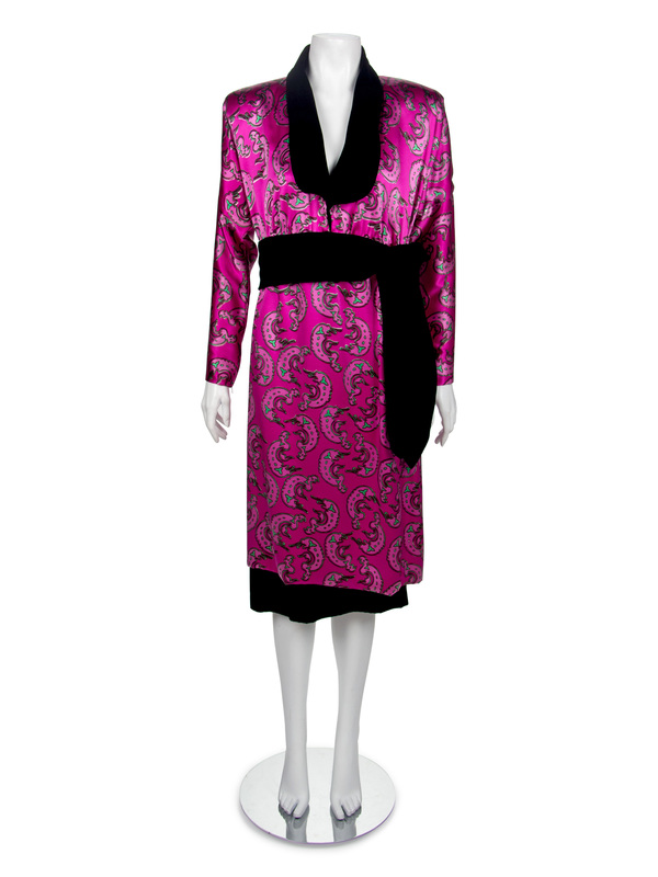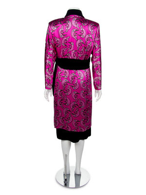 Patterned magenta and green silk tunic with long sleeves, black collar and waist sash, bat wing sleeves, additional removable magenta sash, and side snap and zip closure. Together with a solid magenta silk pencil skirt with seven inch black velvet trim at hem and side zip closure.