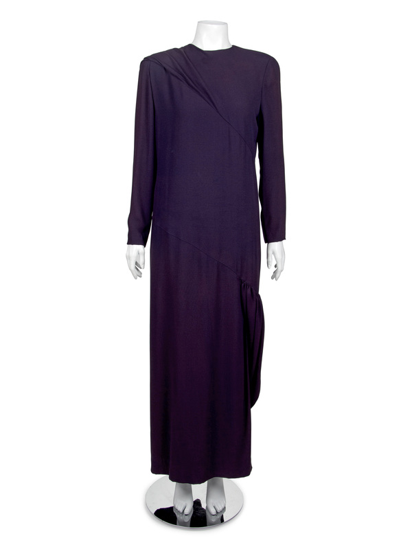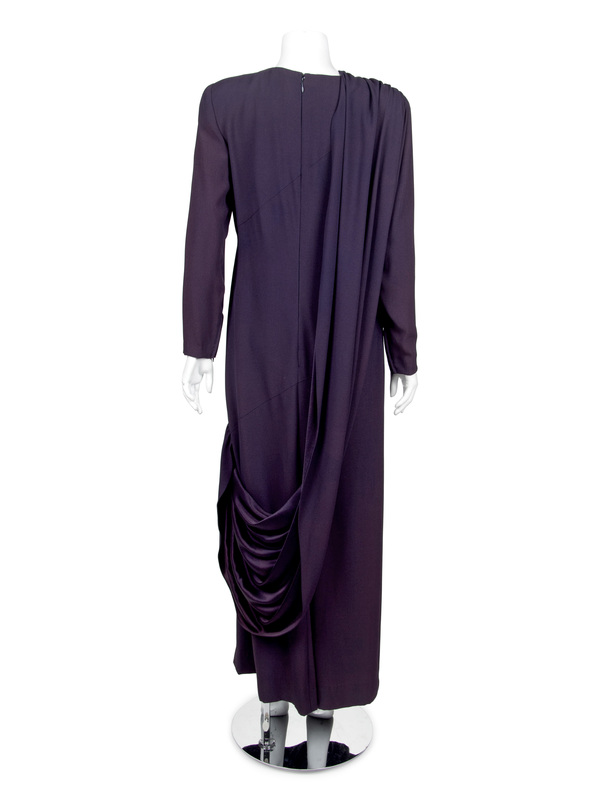 Purple synthetic crepe evening dress with long sleeves, bias seaming at bust and hip, draped panel hanging from shoulder down back to hip, and back zip closure.