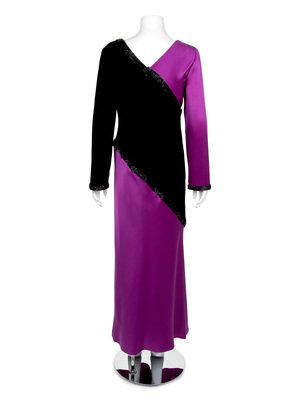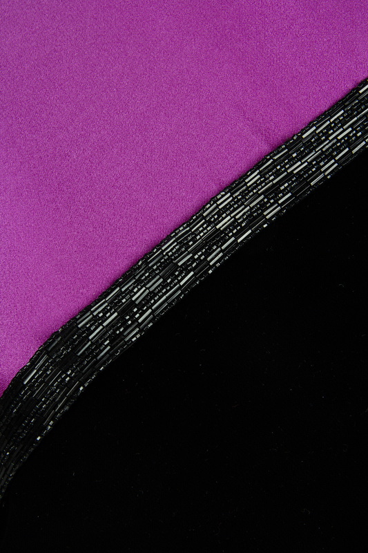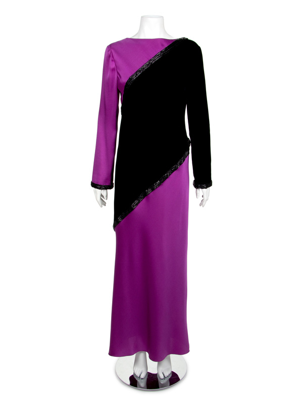 Purple silk crepe evening dress with black velvet asymmetrical inset panel, black beaded trim, long sleeves, boat neckline, and back zip closure.