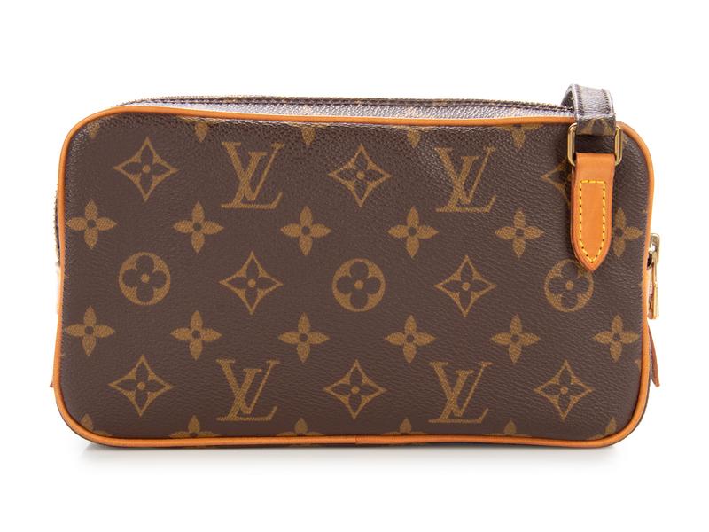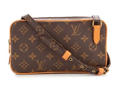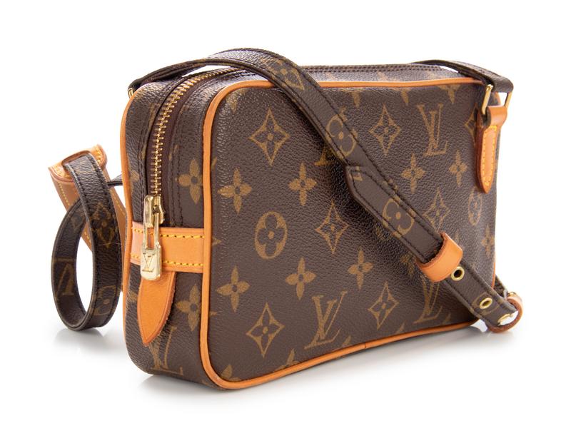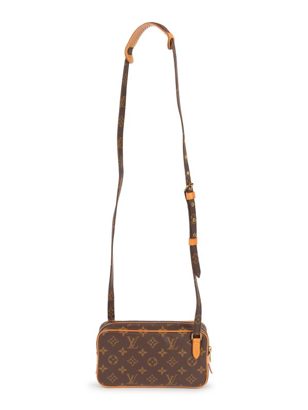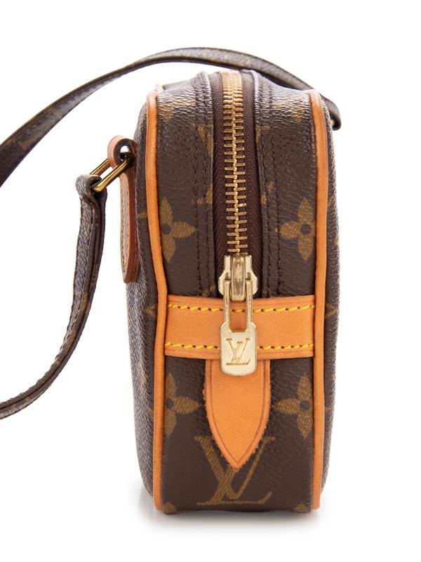 Dark and light brown leather zip top cross body bag with LV logo print and brass-tone hardware.
