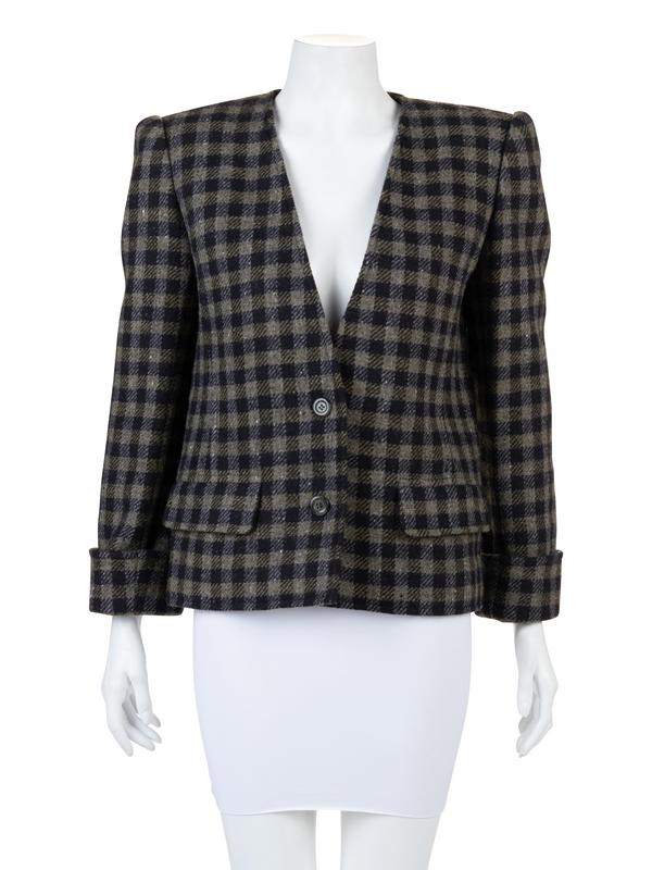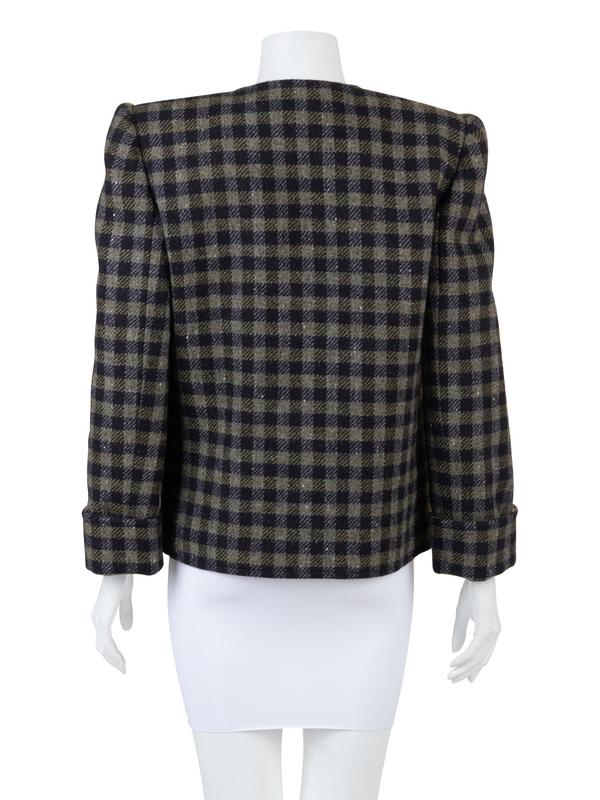 Olive, gray, and black wool tweed check jacket with clean neckline, cuffed sleeves, flap pockets, and two button center front closure.