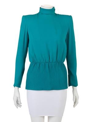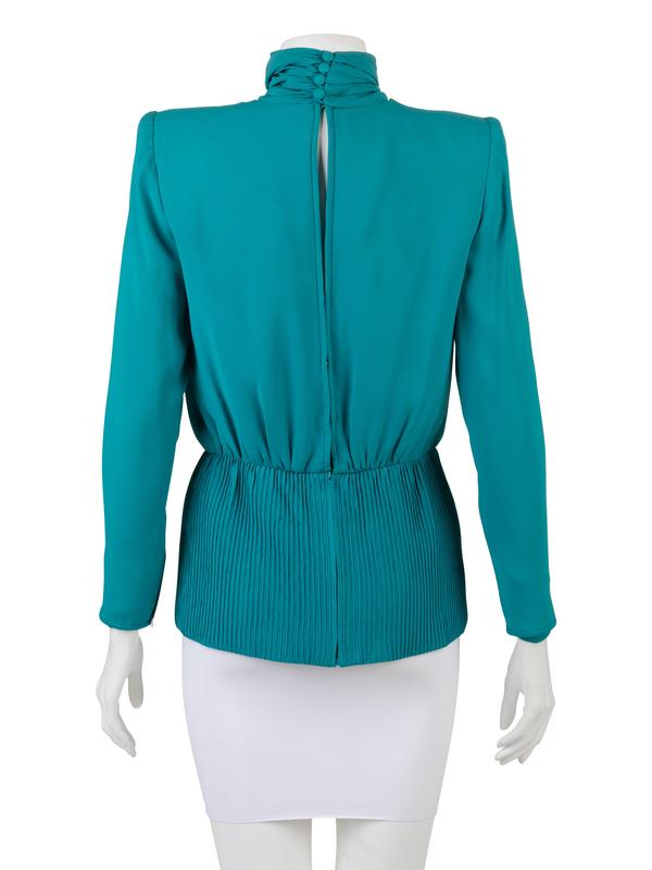 Turquoise silk crepe blouse with draped neckline, pin-tucked lower hem detail, and center back zipper with hook and eye closure.