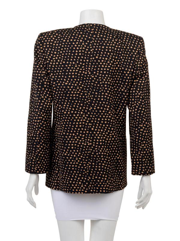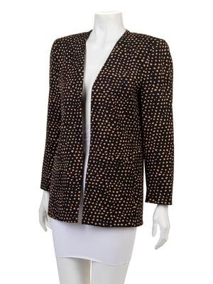 Black with camel spots wool jacket with clean neckline, welt pockets, straight sleeves, and no closure.