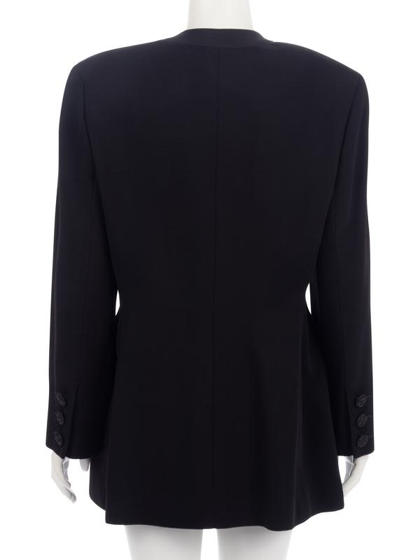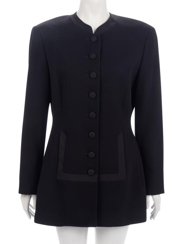 Black wool jacket with mandarin collar, twill ribbon detail at front hip, and center front cord covered button closure.