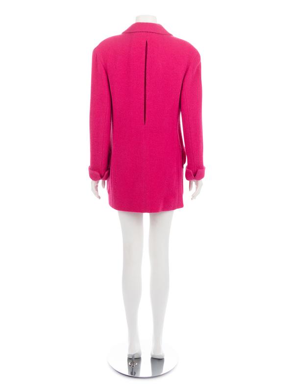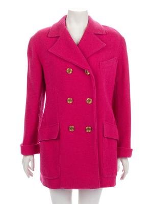 Bright pink French terrycloth double breast coat with gold-tone buttons, cuffed sleeves, and hip patch pockets.