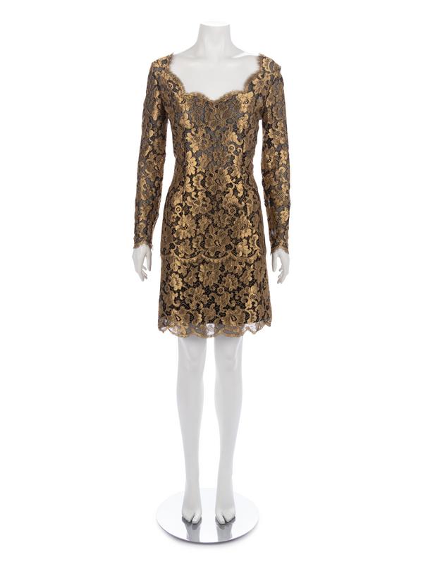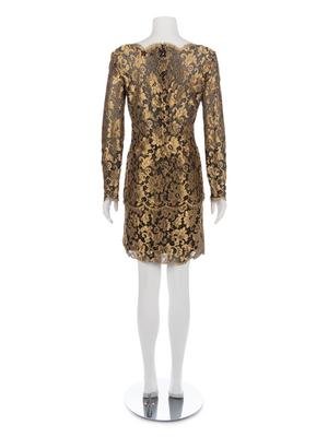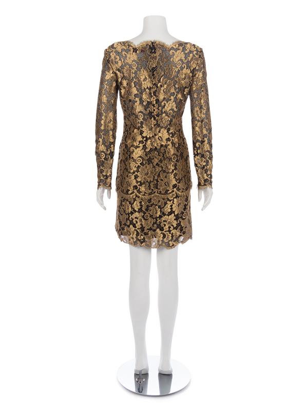 Gold-tone metallic thread lace long sleeve top paired with matching flared skirt.