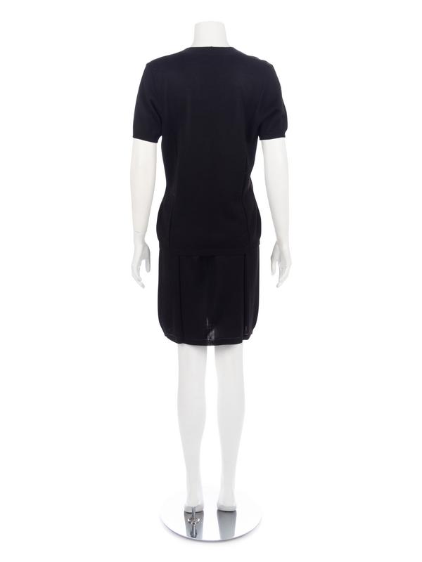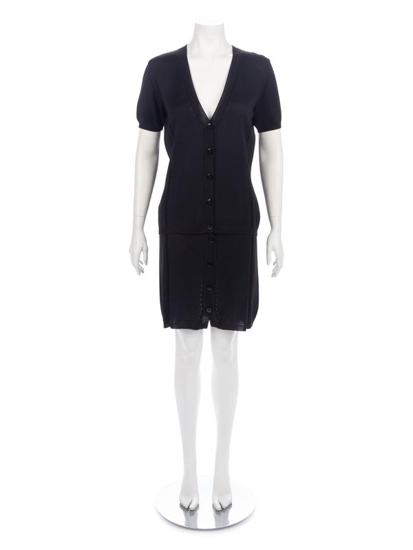 Black mercerized cotton knit short sleeve cardigan paired with matching black knit skirt.