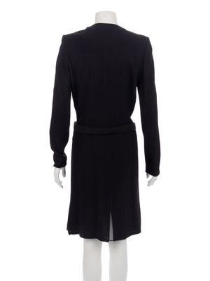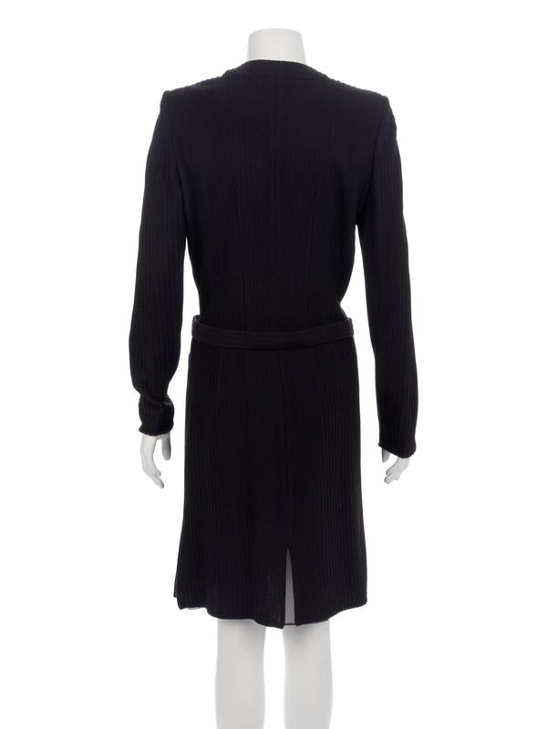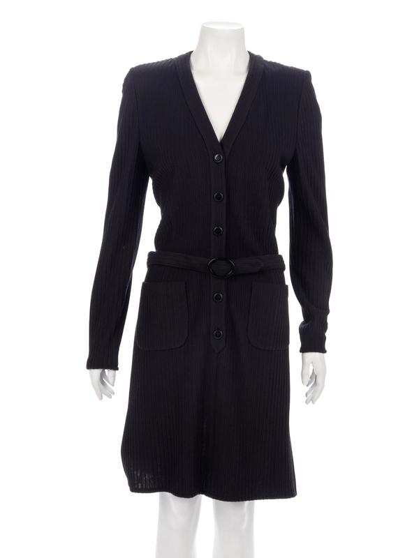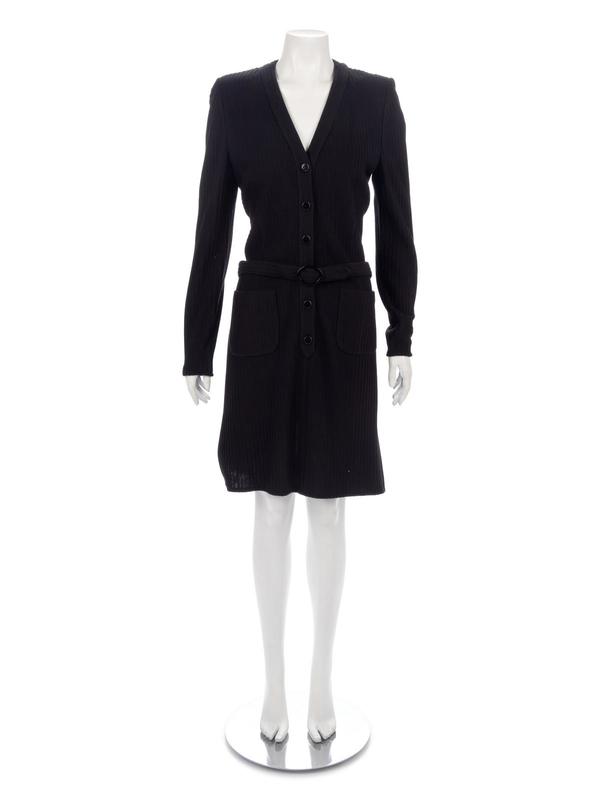 Black wool/acrylic blend ribbed long cardigan dress with belted waist and center front button up closure.